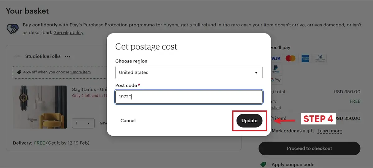 Select the United States as the region and input the postcode from the Global Shopaholics address. Then click on the Update button to finalize your delivery details.