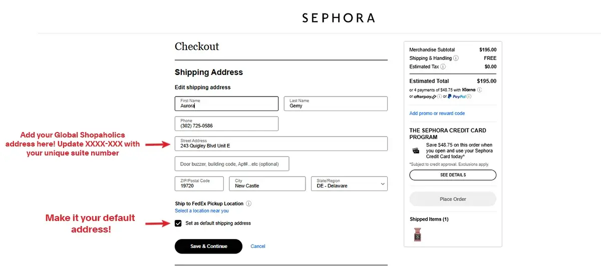Input your Global Shopaholics address, including your unique suite number, as shown in the image. Check the box to make it your default shipping address, then click “Save & Continue” to proceed.
